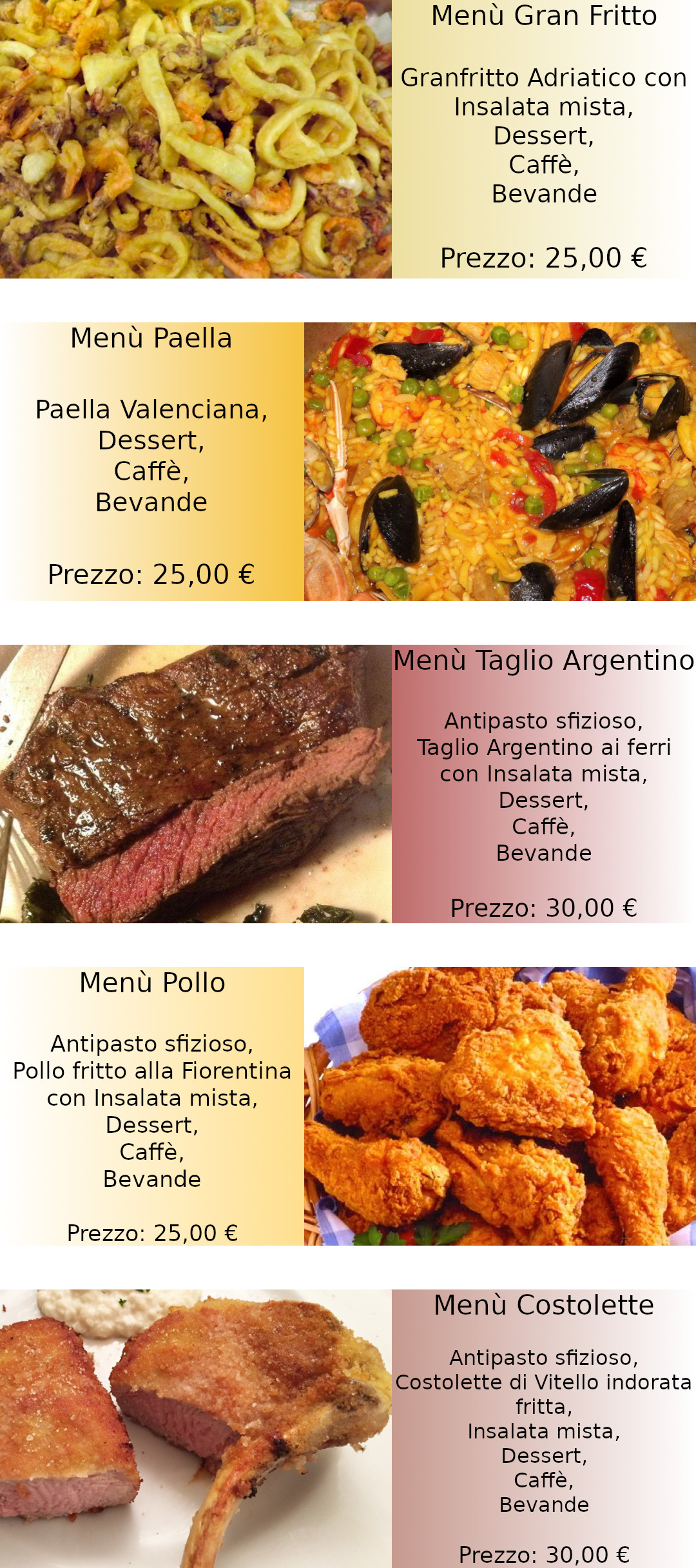 Continua a leggereMenù A PrimoSecondoContornoDolcettoCaffèBevande€ 15,00 Menù B SecondoContornoDolcettoCaffèBevande € 12,00 Menù C PrimoContornoDolcettoCaffèBevande € 10,00